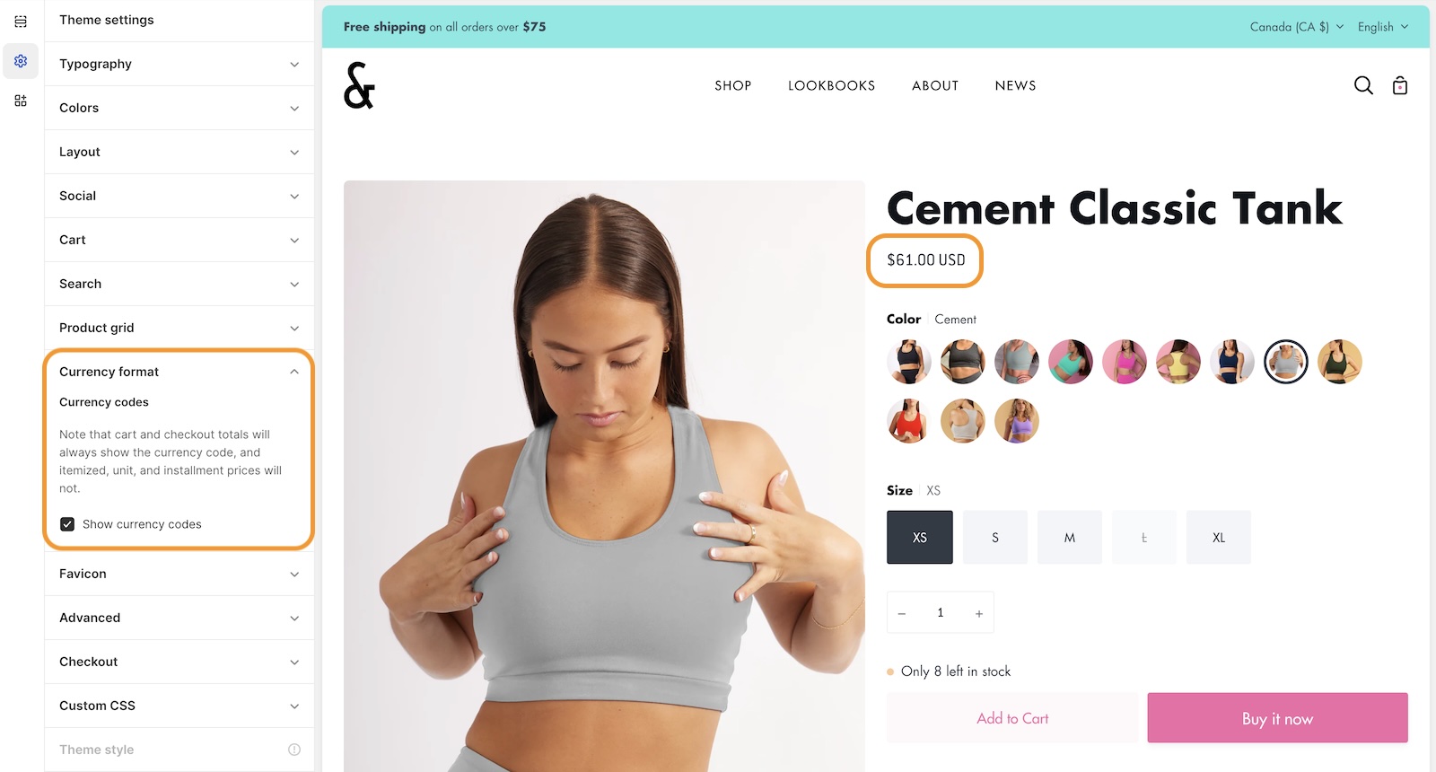 You can toggle displaying the currency code for the Product card and other pages like the Product detail page with this setting: